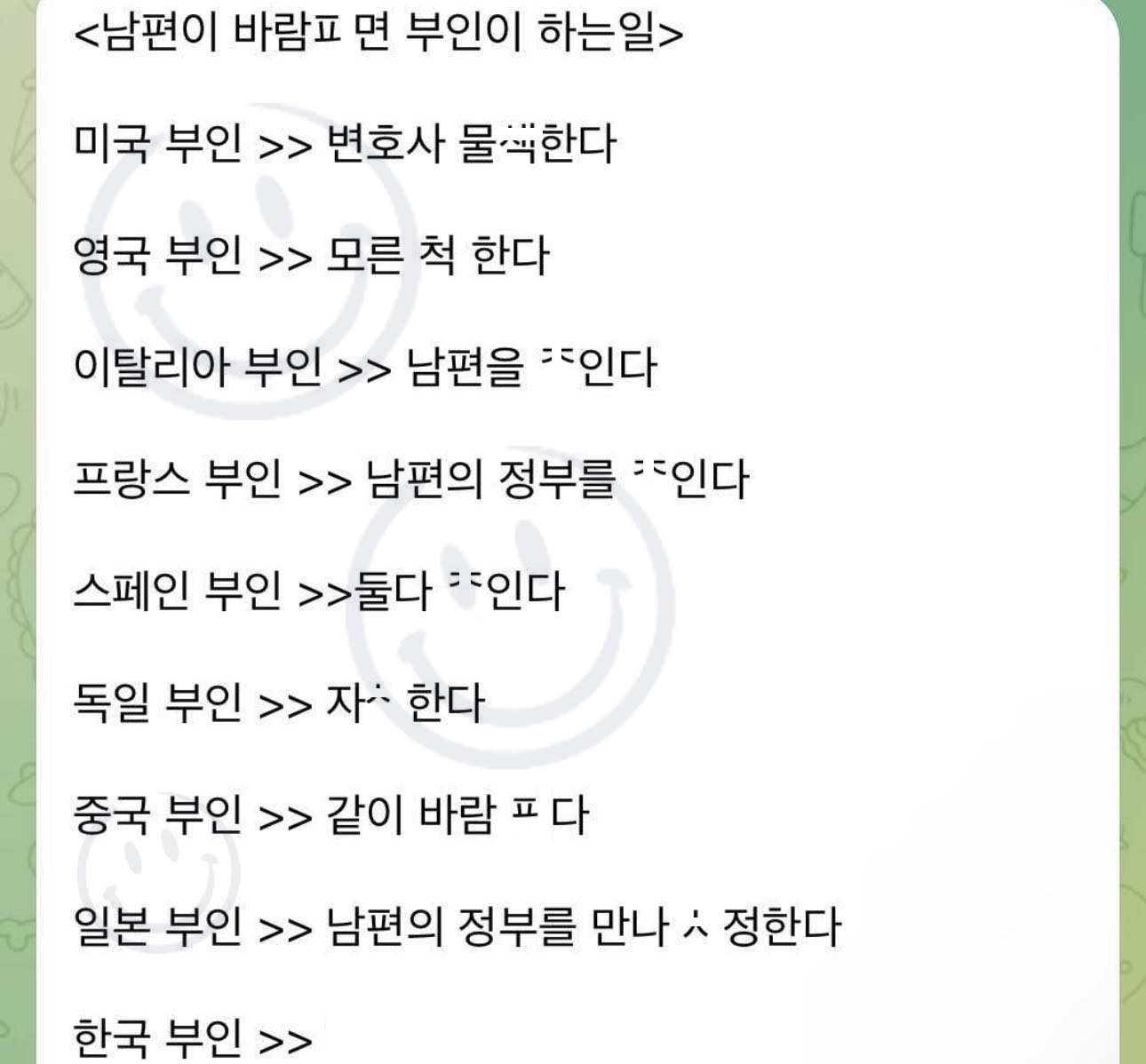 나라별 남편이 바람피면 부인이 하는 일