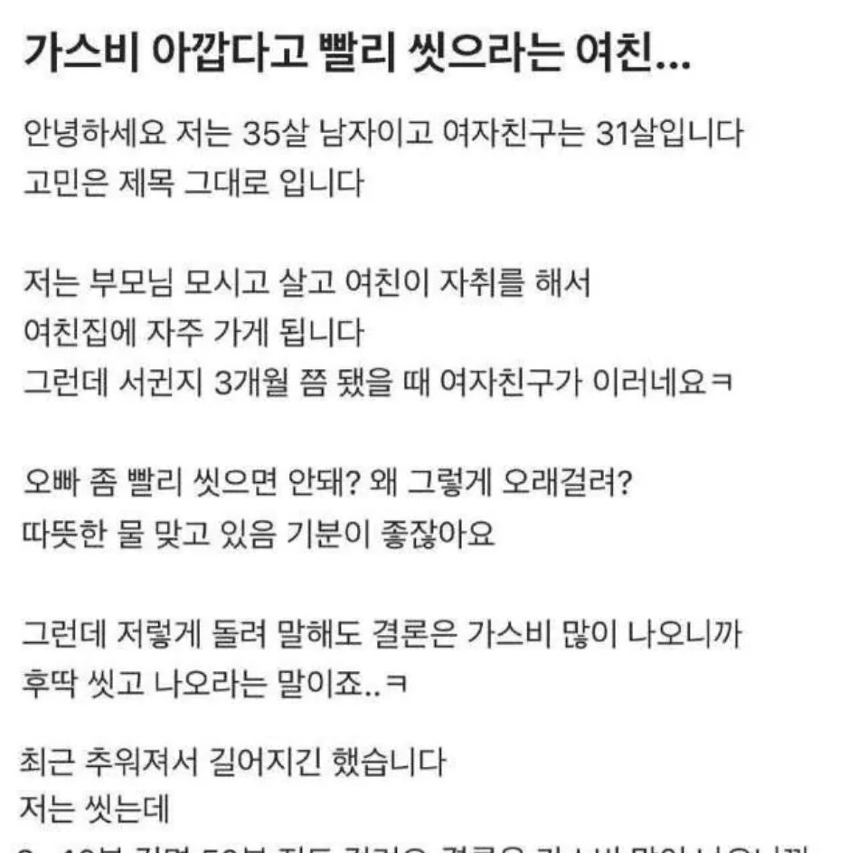 가스비 아깝다고 빨리 씻으라는 여친