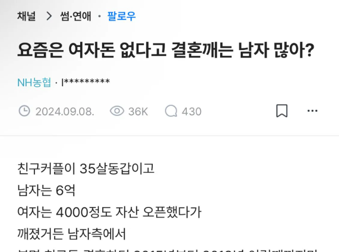 여자 돈 없다고 결혼 깨는 남자