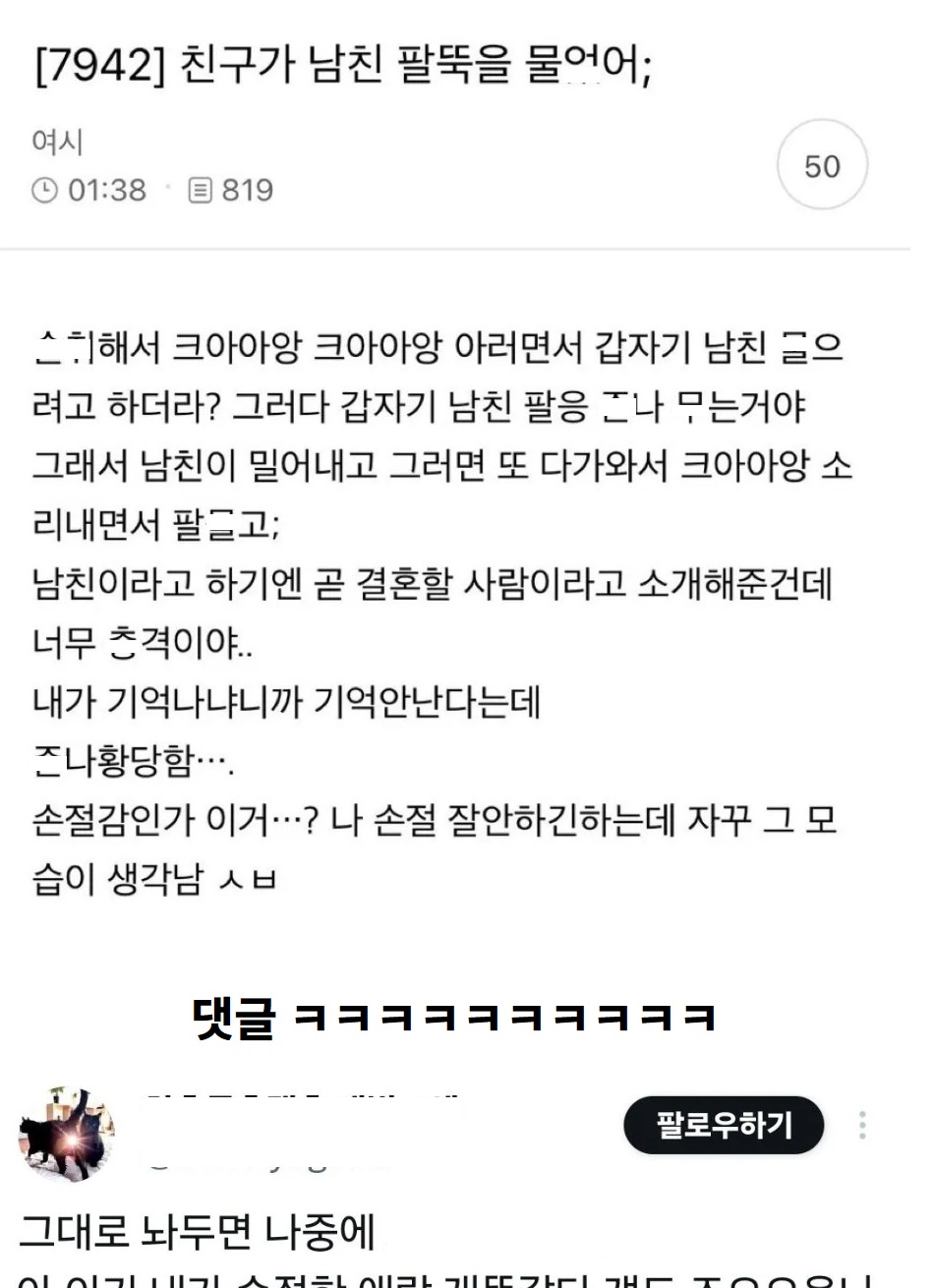 친구가 남친 팔뚝을 ㅁ었어.